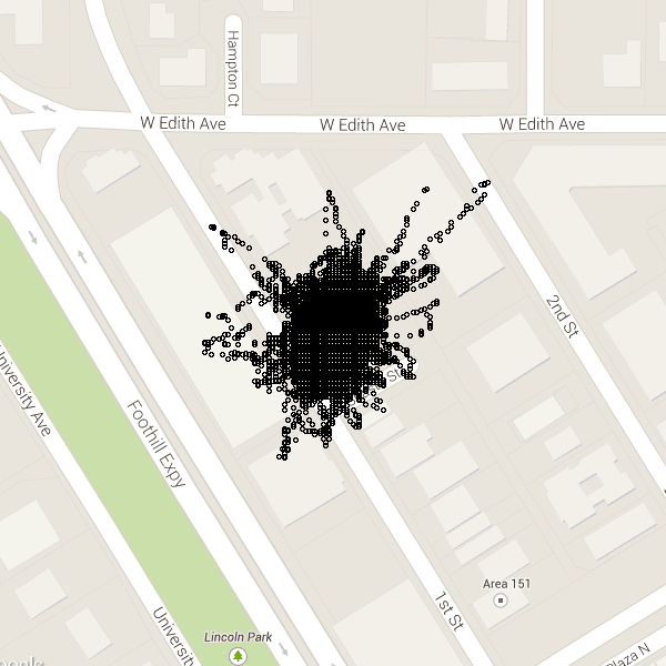 I’ve experimented with assessing the GPS errors themselves. I left it switched on for an entire day, and was able to plot the reported latitude and longitude on a Google Map tile below: