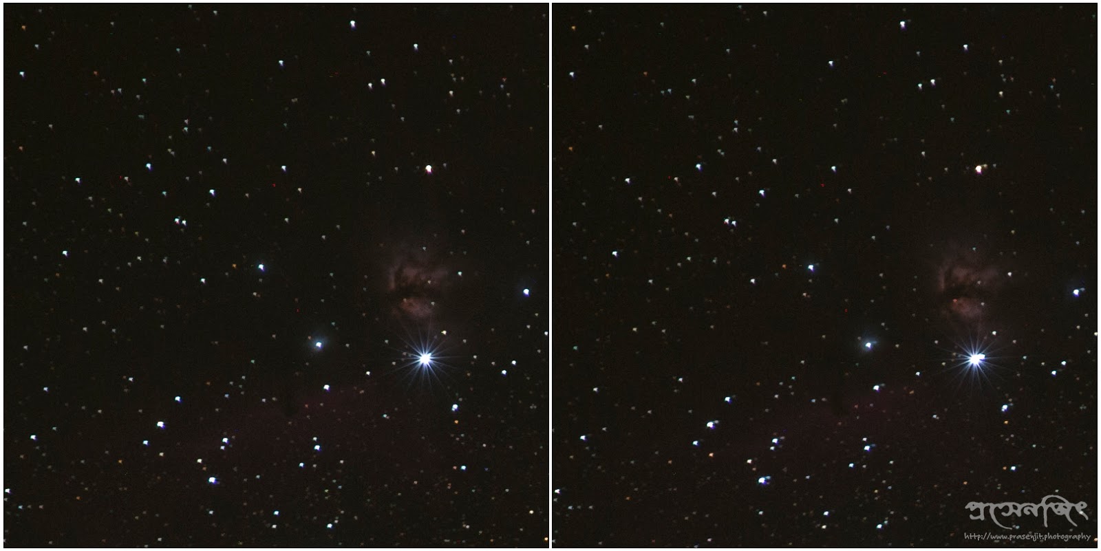 To test this out, I took two photos of Alnitak (Zeta Orionis, or the left-most star on Orion’s belt). The first one is a 120-second exposure at 200mm f/4, ISO 800. The second one was taken with long-exposure NR enabled, but with the camera powered off during the second photo. A side-by-side comparison is shown below (click on it for the full-sized version):